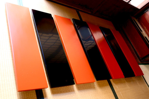 7枚ある板を少し遊び心を入れて奇数は朱色、偶数は漆黒のコンビに塗り替えました。