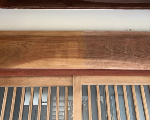 これまでオーナーの表札の跡が残ったままになっていたので気になっていました。欅(ケヤキ)の分厚い板に着色されていた紅殻(ベンガラ)も擦れていて、その上から塗られていた漆も飛んでしまっていました。