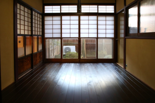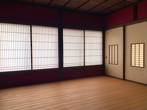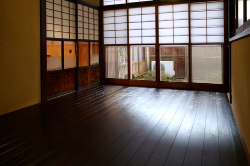 土壁にひびが入り土も落ちていて酷い状態でした。撤去した土壁は軽トラ二杯分で重さが約800キロありました。それに加えて畳が10枚あり。常時、80キロの大人が10人、部屋の中に立っているのと同じだと考えると、柱にかかる負担も軽減できたと思います。床はあすなろの木の綺麗さを見てもらおうとこの部屋だけは漆を塗らずに柿渋だけを2度塗流だけに留めました。この柿渋は柿の実を潰した汁が成分で耐水性があるとのこと。飲み物を零しても染み込み難いそうです。何だか谷崎潤一郎の「陰翳礼讃」の世界です。
