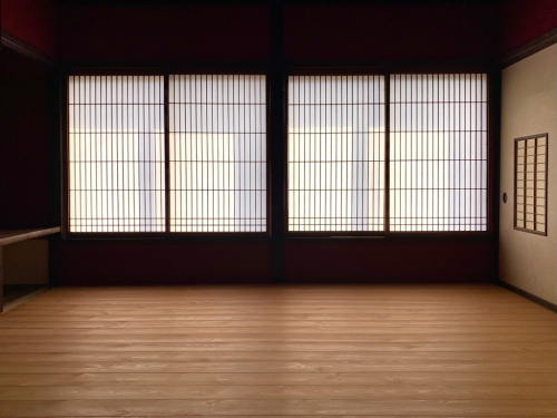 下の写真はダイニング(食堂)です。今後は食器(お椀、お皿、お箸、重箱、米櫃等)を展示予定です。懇親会のおもてなし会場にもなります(笑)。応接間よりも陽が当たり明るいのでフローリングの木目も綺麗に見えます。