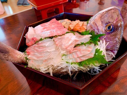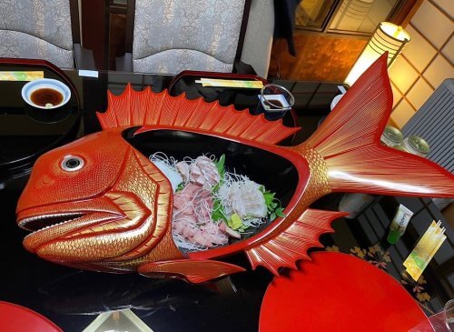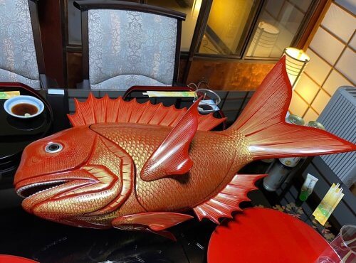 お正月なのでこの時期にしか出番のない輪島塗の鯛型盛器を出してお刺身を盛り付けてみました。お腹の部分が蓋になっていて取り外すことができます。大きさが80cm近くあり、テーブルの大半を占拠してしまいました。