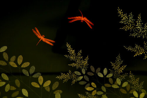 輪島塗の※沈金の作品「秋乃野」。赤トンボが萩の咲く秋の野原を舞っています。この時期にピッタリな作品ですね。私の一番のお気に入りでもあります。