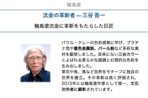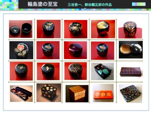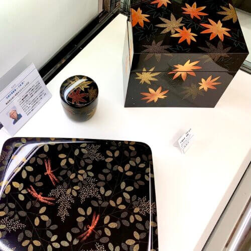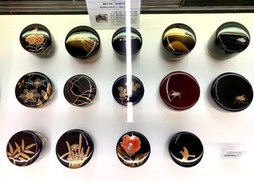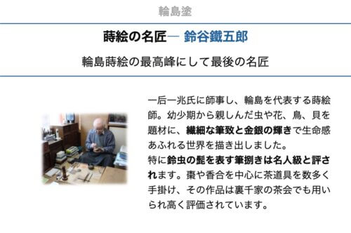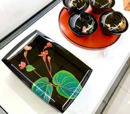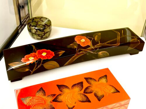 さらに注目いただきたいのは、輪島塗のビンテージ品です。輪島塗で唯一文化功労者に顕彰された沈金の巨匠・三谷吾一、そして鈴虫や椿などの意匠で知られる蒔絵師・鈴谷鐵五郎。
