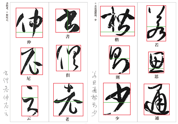 なお、これから示すお手本に、赤い枠(概形)や、グリーンの線(補助線)がありますが、「拡大本・書譜」にはついていませんのでご了承ください。