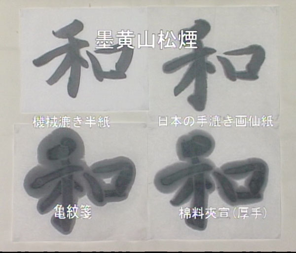 上は中国の松煙墨「黄山松煙」を使っていろいろな紙に書いたもの。