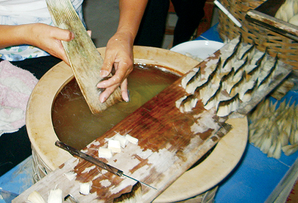幅広のヘラとクシが合体したような、中国独特の道具を使い、練り混ぜの作業を行っています。