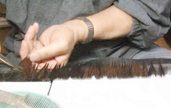 束ねた毛を平らに伸ばし、何度も混ぜ合わせます(練り混ぜ)。
