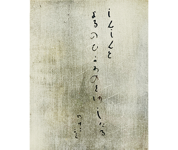 ルーペで見てみると、ベニヤ板の上に何か色のものを塗ってから、普通にかなを書いています。