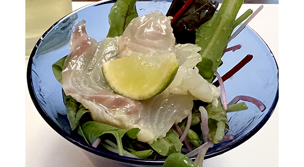 鯛のお刺し身は煎り酒とオリーブオイルで味付けされています。