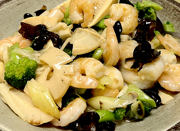 エビ、たけのこ、ブロッコリ、ネギ、きくらげが入っています。