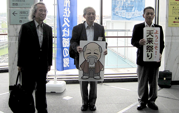 NPO法人未来工房もちづきの理事長、吉川徹さんが「天来くん」を持ってお出迎え。