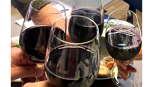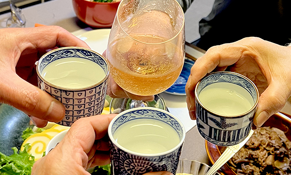 1つだけでかい顔をしているグラスはですね、隊長がコロナワクチンの副反応で、突発性難聴になってしまい、治療中のためにお酒が飲めないので、シャンパン風のノンアルコール飲み物となりました。(一番おいしそう)