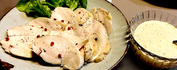 鶏むね肉を袋に入れて60度で2時間、袋から出して1分加熱して殺菌します。
