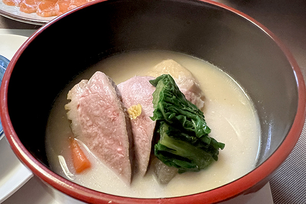 昆布出汁に、鴨肉、味噌味で茹でた聖護院かぶ、人参、かつお菜。