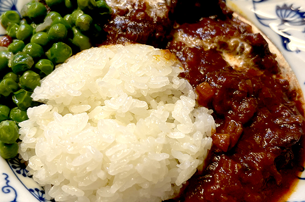 濃厚なグヤーシュと白いご飯とえんどう豆。