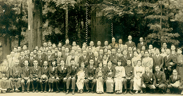 下列左は、田代秋鶴先生とともに石碑の建設副委員長をつとめられた鈴木翠軒先生、右端は天来の次女、比田井千鶴子、その左は尾上柴舟先生です。