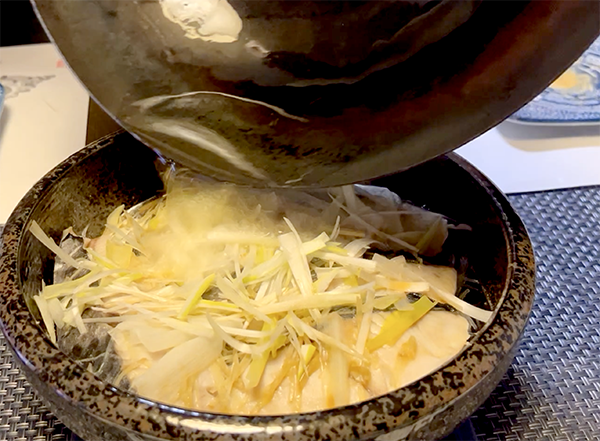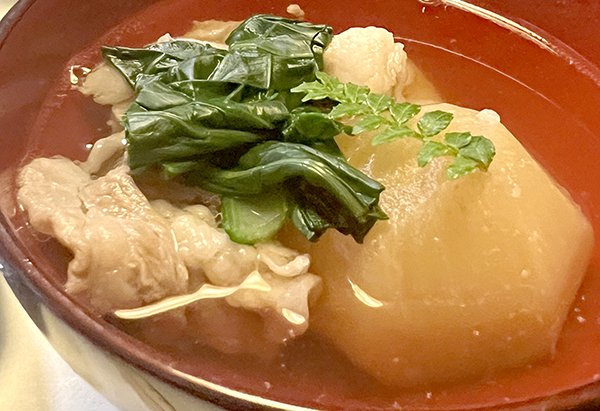 蕪と、黒豚のバラ肉ごく薄切りとほうれん草のおつゆ、山椒のせなんですが、この作り方がはんぱじゃない。