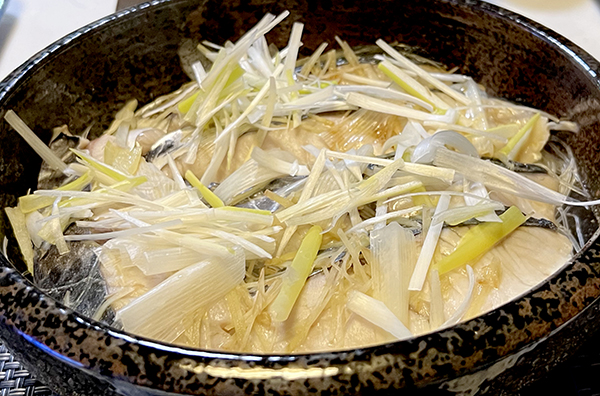 酒蒸ししたさわらの上にネギが載っているわけですが。