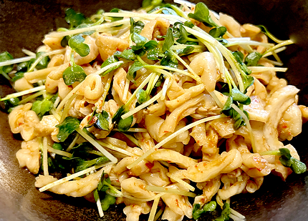 鶏皮とかいわれ大根のコチュジャンポン酢あえ。