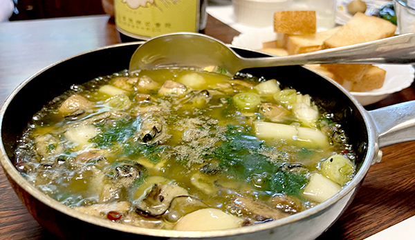 ニンニク香る牡蠣、マッシュルーム、長ネギのアヒージョです。