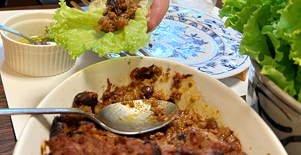 レタスといっしょにいただけば、濃厚さがさらに際立つというか、やわらぐというか、食べやすい上に栄養的にも二重丸。