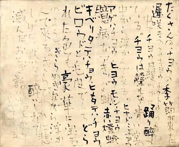 1957年に第9回毎日展に出品したのが、いろはにほへと、、、で紙面に沢山の文字が埋め尽くされています。