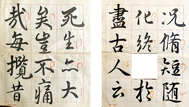 で、よく見ると、3と4(下段)は朱の筆が違うので、なにくそと臨書に励んだ後の様ですね。