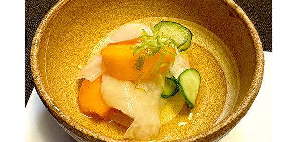 ほたて、柿、大根、きゅうりの土佐酢あえに柚子が乗っています。