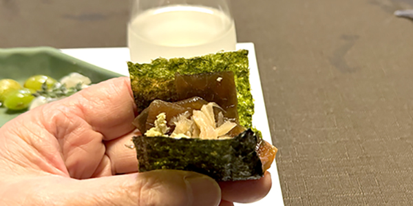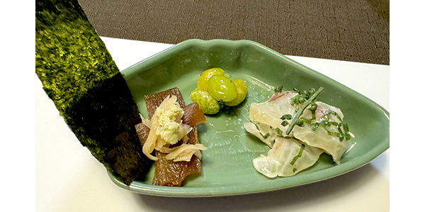 右は昆布締め鯛の紫蘇あえ柚子しぼり穂紫蘇のせオリーブオイルがけ。(なんと!)