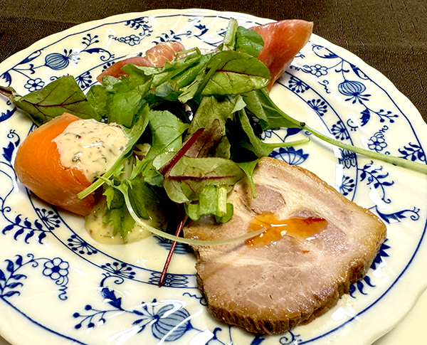 左はスモークサーモンでモッツアレラチーズとアボカドを巻き、オニオンとハニーマスタードとポン酢とマヨネーズを混ぜたソースをかけました。