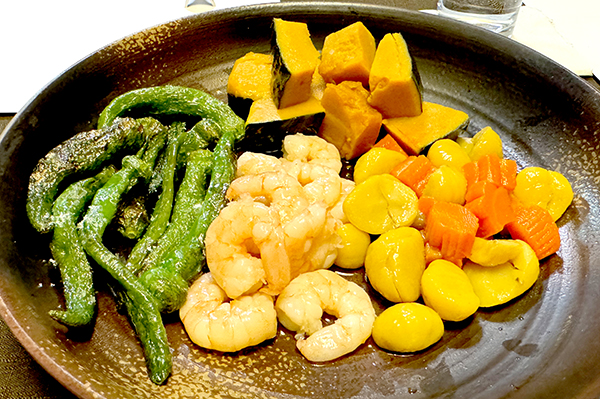 ほっくり栗とカボチャ、ぷりぷりエビ、ちょっぴり刺激的な万願寺とうがらしの歯応えが最高の組み合わせ。