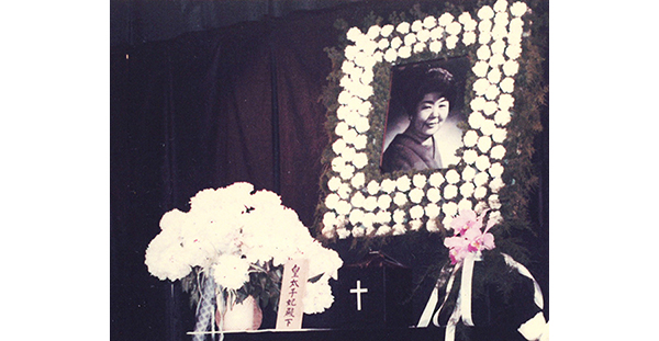 告別式に飾られた写真、左は美智子さまから賜った芍薬です。
