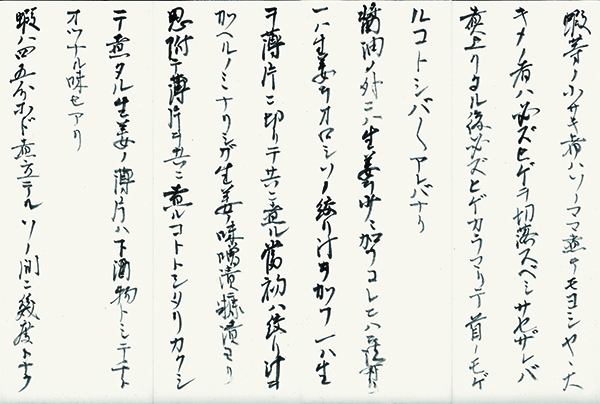 なお、この他にも酒の肴として蕗味噌、葉山葵漬け、胡瓜もみ等特別のものもあるが、今は捨て置く。