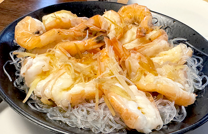 エビと春雨の蒸し物が出てきたと思ったら、煮立った油をジュッとかけた。