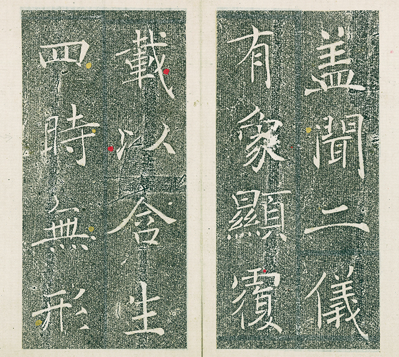 よく見ると、一行目「聞」と四行目「四」「時」「無」「形」に金色の圏点が、二行目「覆」三行目「載」「以」に朱色の圏点が見えます。