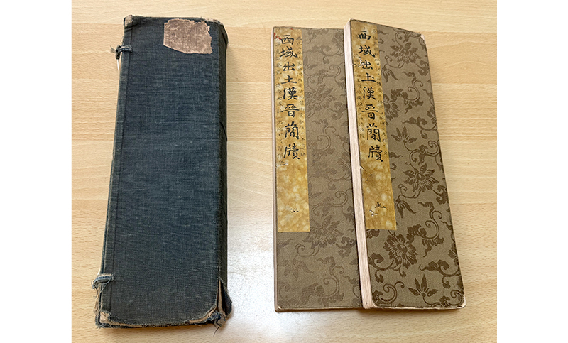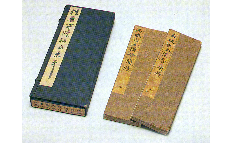 左の帙の題箋は比田井天来書「漢晋簡牘沙氏原本」 折帖の題箋は松田南溟書「西域出土漢晋簡牘」です。