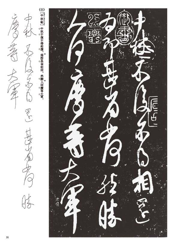 - 図版(散情帖/先夜帖/得西帖/還此帖/諸舎帖/玄度帖/外甥帖/姉性帖/想彼帖/諸女帖/奉別帖/鵞還帖/適奉帖/奉対帖/大都帖/八月十九日帖/豹奴帖/服油帖/復面帖/十二月帖/送梨帖/中秋帖/蘭草帖)/解説/字形と筆順/収載目録