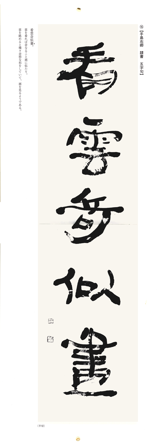 - 田代秋鶴(行書 五言絶句、行書 七言二句…ほか)/大沢雅休(行書 五言絶句良寛詩、行草書 良寛詩古意二首)/上田桑鳩(行草書 六言二句、楷書 画賛…ほか)/松本芳翠(楷書 五言絶句劉禹錫詩、草書 五言絶句張意詩…ほか)/徳野大空(行草書 七言二句)/手島右卿(楷書 四字句、隷書 五字句…ほか)/松井如流(行書 四字句、行草書 五言律詩杜甫詩…ほか)/桑原翠邦(楷書 五字句、行草書 七言二句…ほか)/石田栖湖(篆書 七言二句、草書 四字句…ほか)/金子鷗亭(隷書 四字句、若山牧水短歌…ほか)/名家紹介/字形について
