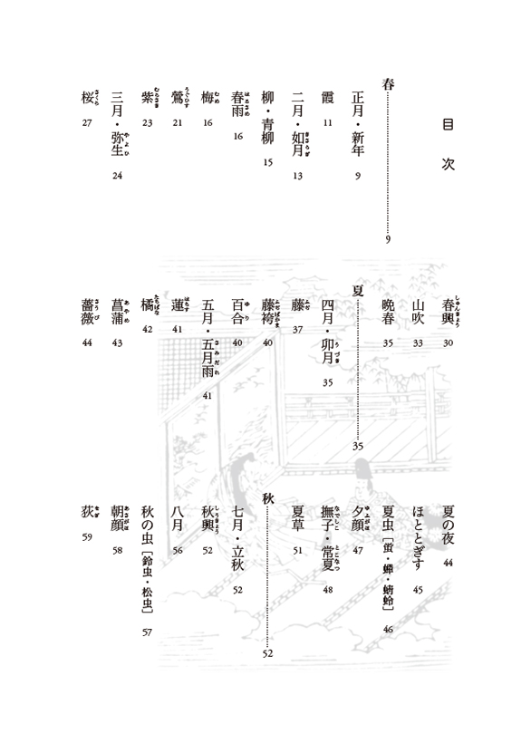 - 春 正月・新年/霞/2月・如月/柳・青柳/春雨/梅/鶯/紫/3月・弥生/桜/春興/山吹/晩夏 夏 4月・卯月/藤/藤袴/百合/5月・五月雨/蓮/橘/菖蒲/薔薇/夏の夜/ほととぎす/夏虫(蛍・蝉・蜻蛉)/夕顔/撫子・常夏/夏草 秋 7月・立秋/秋興/8月/秋の虫(鈴虫・松虫)/朝顔/荻/萩/尾花/女郎花/秋の夜/月(朧月・夕月夜・十三日の月・十五夜・二十日の月・有明・臥待の月)/9月/野分/雁/菊/晩秋 冬 10月・神無月/紅葉/立冬/冬の景/11月/時雨/霜/霰/雪/12月・師走 天象 日・月/霧/雲 宇治/春秋の定め/六条院/月齢表/24季節気表