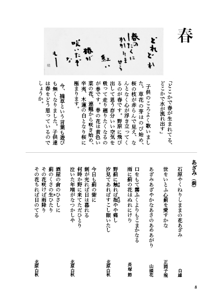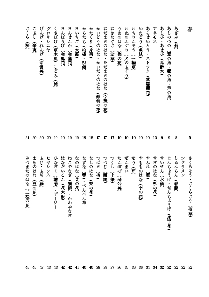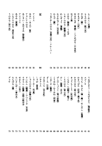 - 【春】あざみ/こぶし/さくら/つくし…ほか【夏】あじさい/あやめ/くちなし/なでしこ/ばら…ほか【秋】あかね/きく/コスモス/すすき/ふじばかま/ほととぎす…ほか【冬】カトレア/かんつばき/すいせん/なんてん/ふくじゅそう…ほか【花】