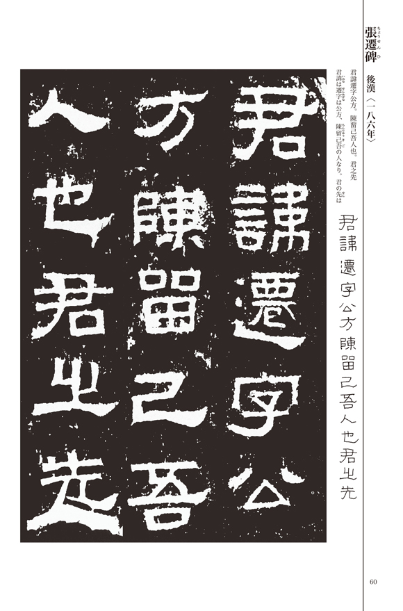 - 甲骨文/金文/石鼓文/泰山刻石/魯孝王刻石/莱子候刻石/開通褒斜道刻石/石門頌/礼器碑/史晨碑/西狭頌/郙閣頌/曹全碑/乙瑛碑/張遷碑/木簡 解説(古典の解説・字形の解説・筆順)