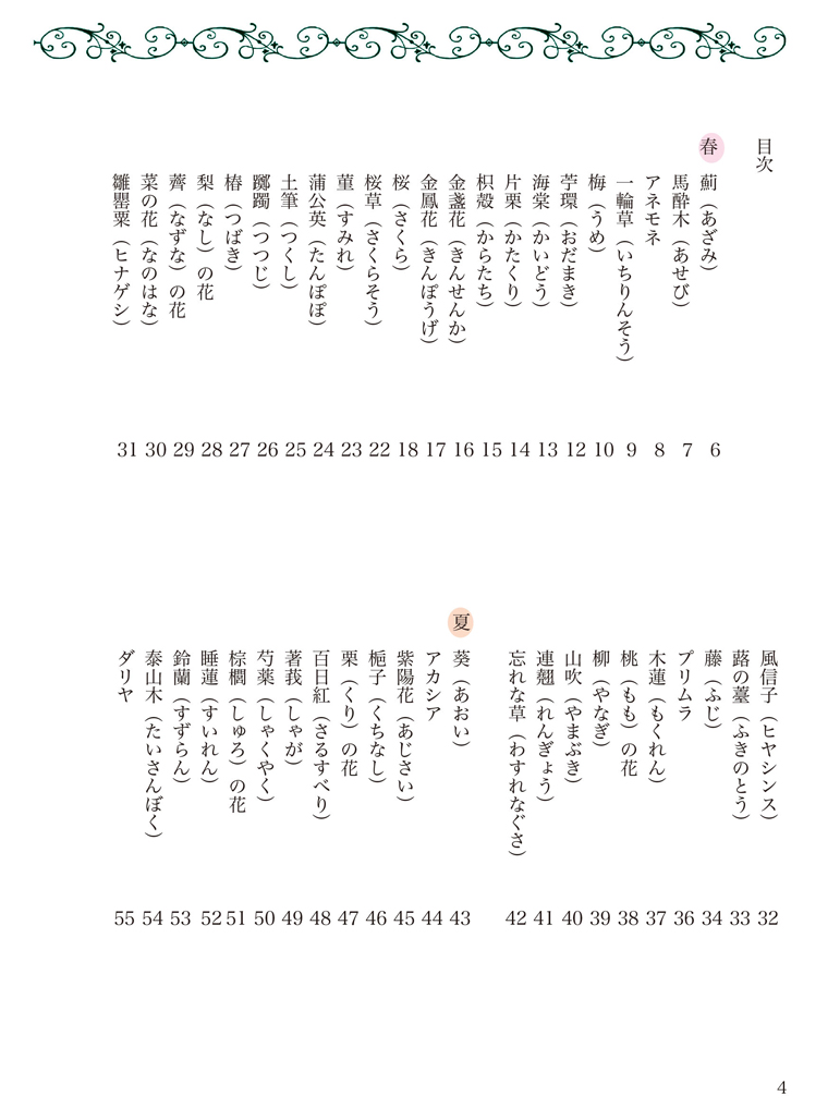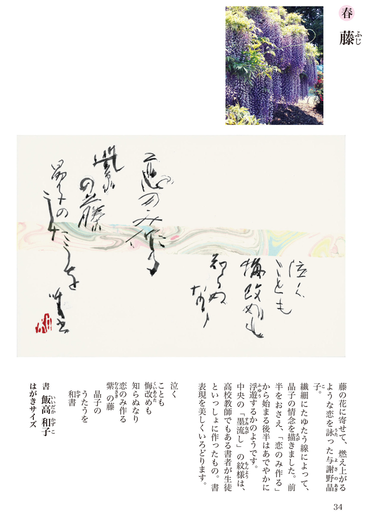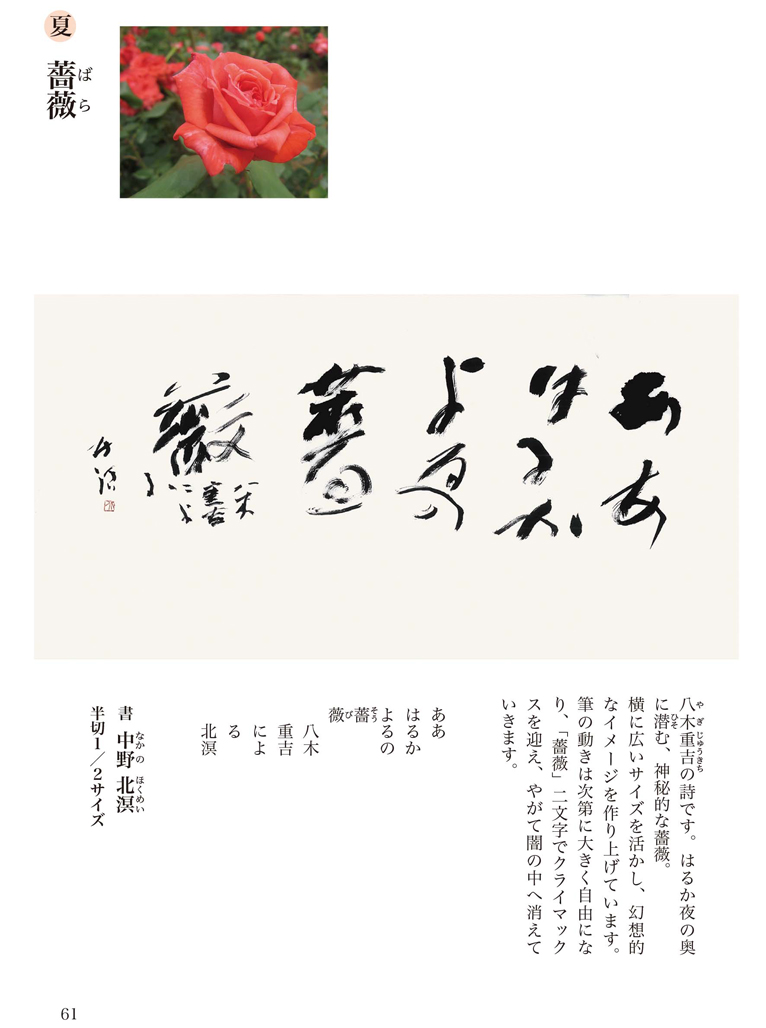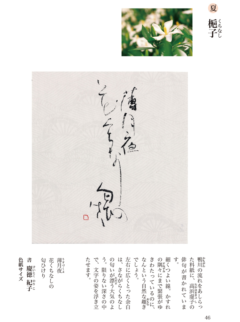 - 【春】おだまき/かたくり/さくらそう/なのはな/わすれなぐさ…ほか【夏】さるすべり/しゃくやく/すいれん/なでしこ/ゆり…ほか【秋】いちょう/ききょう/つゆくさ/はぎ/ほうせんか/りんどう…ほか【冬】さざんか/すいせん/つわぶき/ふくじゅそう…ほか【その他】書道で使う文房具について/書作品に使われる紙のサイズ/書道用品が買えるサイト