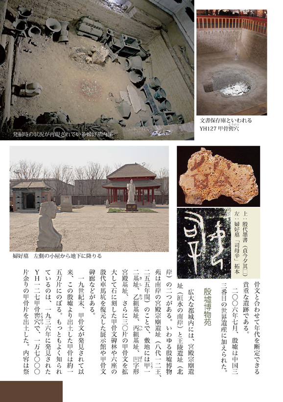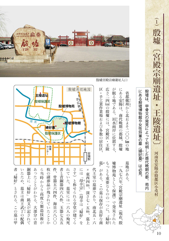 - 【重要史跡】殷墟(宗廟遺志址・王陵遺址)・里耶古城・岱廟と泰山・漢中と石門・西狭頌・王羲之故居と蘭亭・爨宝子碑・爨龍顔碑・中岳嵩高霊廟碑と嵩山三闕・孔子古里・鄭道昭の三山・晋祠・大雁塔と雁塔聖教序・顔真卿の史跡【三大石窟】雲崗・龍門・莫高窟【見逃せない史跡】大禹陵・徐州周辺〈徐州博物館〉・雅安漢代石刻・韓仁銘・上尊号奏・受禅表・禅国山碑・蔡侯祠と谷朗碑・万仏堂石窟・四山摩崖刻石と嶧山・焦山碑林・昇仙太子碑【六大博物院】北京故宮博物院・台北故宮博物院・河南博物院・河北博物院・山西博物院・南京博物院【十大博物院】中国国家博物館・上海博物館・山東博物館・遼寧省博物館・湖北省博物館・湖南省博物館・西安碑林博物館・陝西歴史博物館・雲南省博物館・新疆ウイグル自治区博物館【12の特色ある博物館】中国文字博物館・偃師商城博物館・宝鶏青銅器博物館・荊州博物館・長沙簡牘博物館・揚州博物館(揚州双博館)・連雲港市博物館・南京市博物館(朝天宮)・山東石刻芸術博物館・天津博物館・昭陵碑林博物館・中央研究院歴史語言研究所