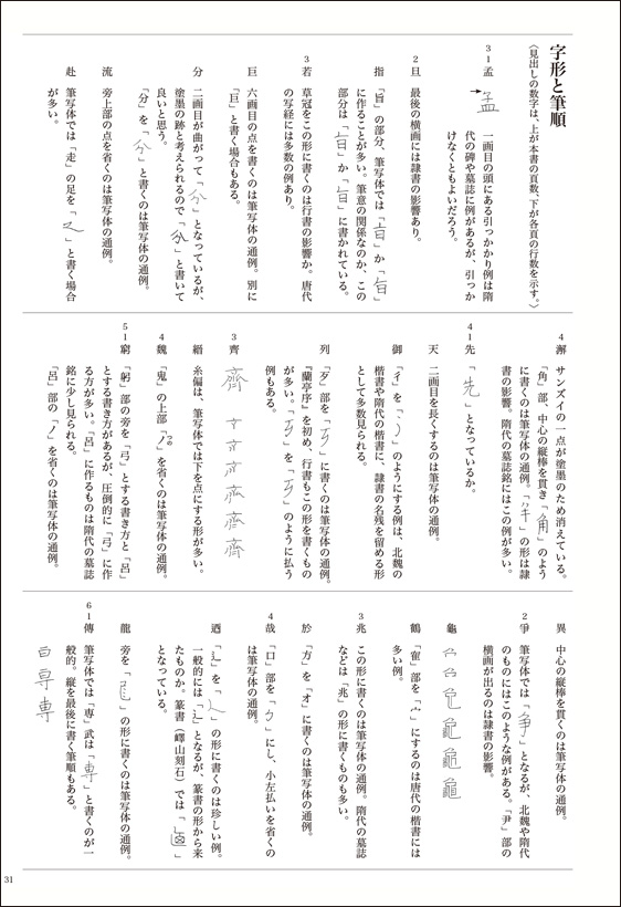 - このシリーズの特徴 /古典の臨書とは /筆写体について /図版/釈文・訓み下し文・骨書/現代語訳/解説/用筆について/字形と筆順/臨書作品制作のために(節臨に適した箇所)