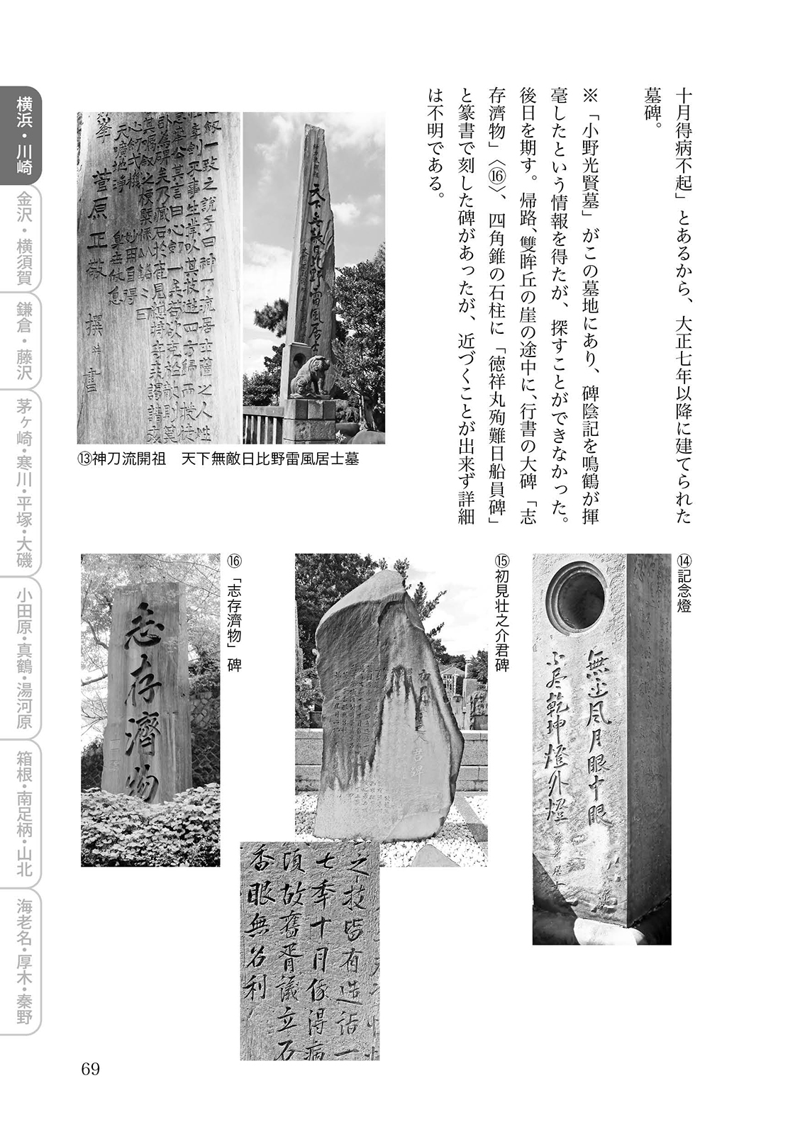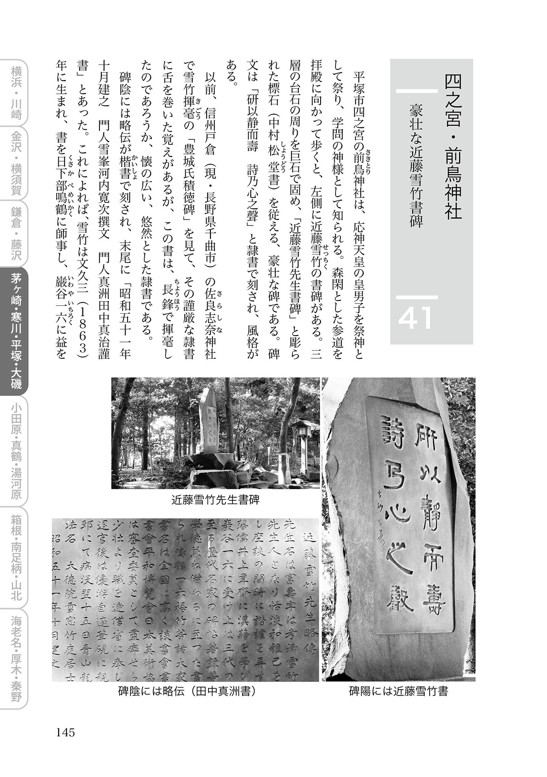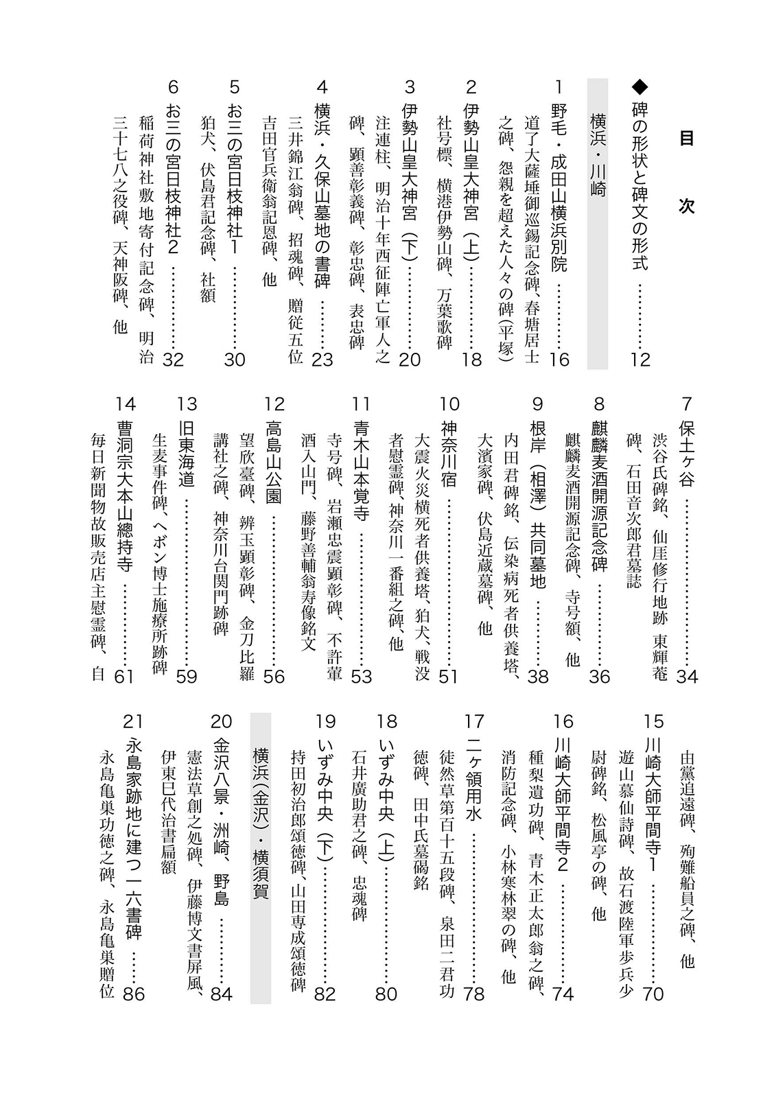 平成29年4月より令和3年4月まで産経新聞神奈川版に連載(49回)された「書のある散歩道かながわ」をベースに加筆訂正を施し、その後も継続した探訪記を書き下ろしで追加。碑の紹介文とともに多数の図版を掲載し、原碑及び碑面の文字を部分拡大して収録。また、探訪に便利な地図、わかりやすい索引を付けました。