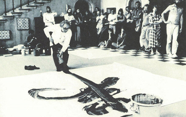 現在墨象では、文字を素材とする場合と、しない場合があります。私は古篆の字形によって出発し、発展させて来ましたが、今回はこれらに拘わらないでやって見ました。しかし私は勿論、文字に拘わることが初歩的段階で、そうでないものが進んだものであるとか、或は前者が書で、後者は書でないという様なことは、少しも考えて居りません。今後もきっと文字から離れたり、付いたりするであろうと思います。たゞたとえ文字性から離れても、書の先人達によって、三千年の間に培われ練り上げられた書の心と美から断絶したり、或はこれを捨てゝしまっては無意味だと思います。たとえばバルトークは、19世紀の音楽と全くかけ離れた、新しい形式の四重奏曲の中に、ベートーヴェンの感動的な楽節をそのまゝ用いている程、古典と結ばれているように思われます。