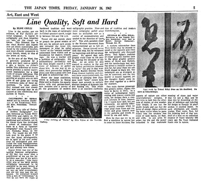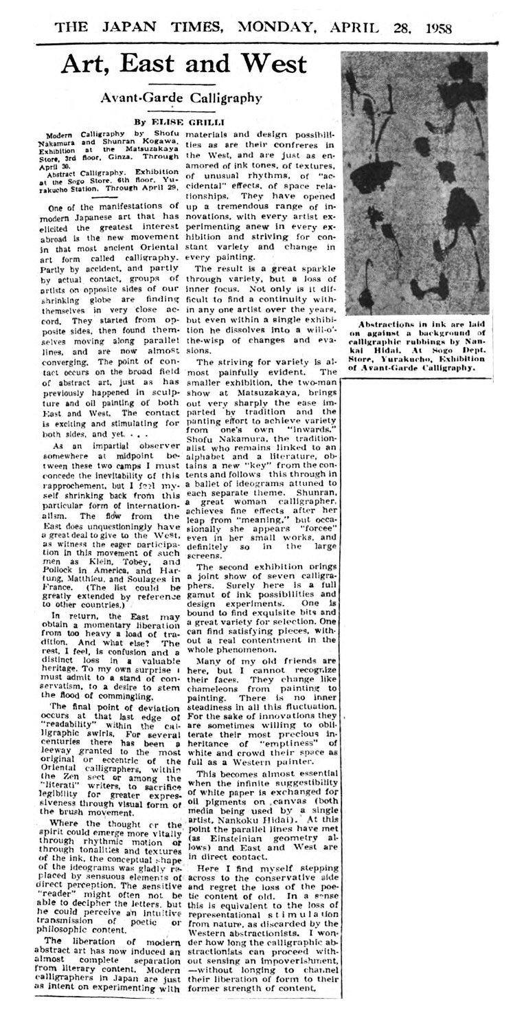 2023年1月27日、√k contemporary での「Hidai Nankoku」展にエリーゼ・グリリさんのご子息ピーター・グリリさんから、エリーゼのジャパン・タイムズの批評記事のコピーがメールで送られてきました。1961年の記事に関しては、前回のVol.23で発表しました。続いて最初の1958年の批評と1962年の記事を訳してみます。