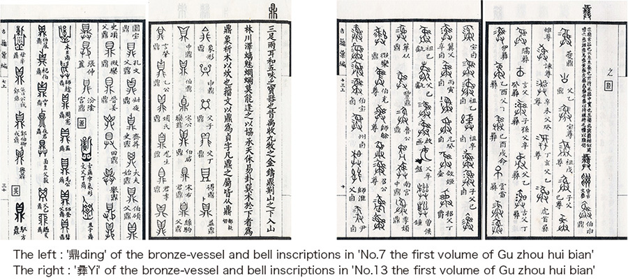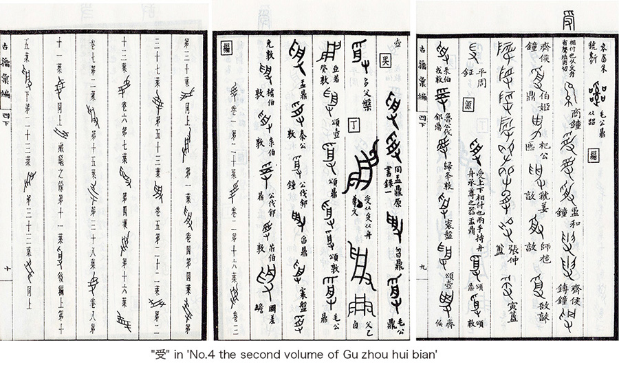 Note : 'Gu zhou hui bian' edited by 徐文鏡 (Xu Wenjing). Xu Wenjing researched for a variety of ancient character’s artifacts such as the inscriptions on bones and tortoise carapaces in Shang Dynasty, the bronze-vessel and bell inscriptions in Shang and Chou Dynasty, the stone-drum inscriptions, bronze artifacts and gold-inlaid characters or inscriptions of ancient imperial seals, ceramics, coins, weapons in Chin Han Dynasty, etc. About 3,000 pieces per single character. Compiled according to the explanation of each character scholar. Completed in 1934.