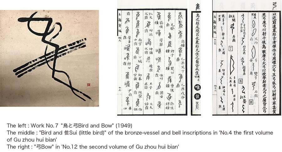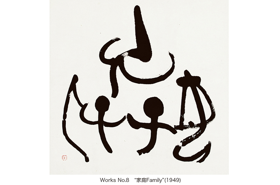 The 7th work in 1949, "鳥と弓Bird and Bow," combines the form of "Bird and 隹Sui (little bird)" of the bronze-vessel and bell inscriptions in 'No.4 the first volume of Gu zhou hui bian' and the form of "弓Bow" in 'No.12 the second volume of Gu zhou hui bian'. The image of the character has been fading any longer, and it has created an especial taste as a new form of the line. The 8th work is titled "家庭Family", and there are a "father" of the bronze-vessel and bell inscriptions at the top, "woman" on the right side, and two "children" which connect hands, and the left end is connected to "person".