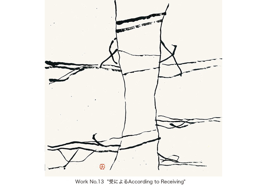 The 12th-B, the 13th work "受によるAccording to Receiving" and the 13-B are works which boldly deformed the form of "Receiving" of the inscriptions on bones and tortoise carapaces in "受" in 'No.4 the second volume of Gu zhou hui bian' as entitled it. The rhythm of the brush line repeated in the form like a ladder is comfortable.